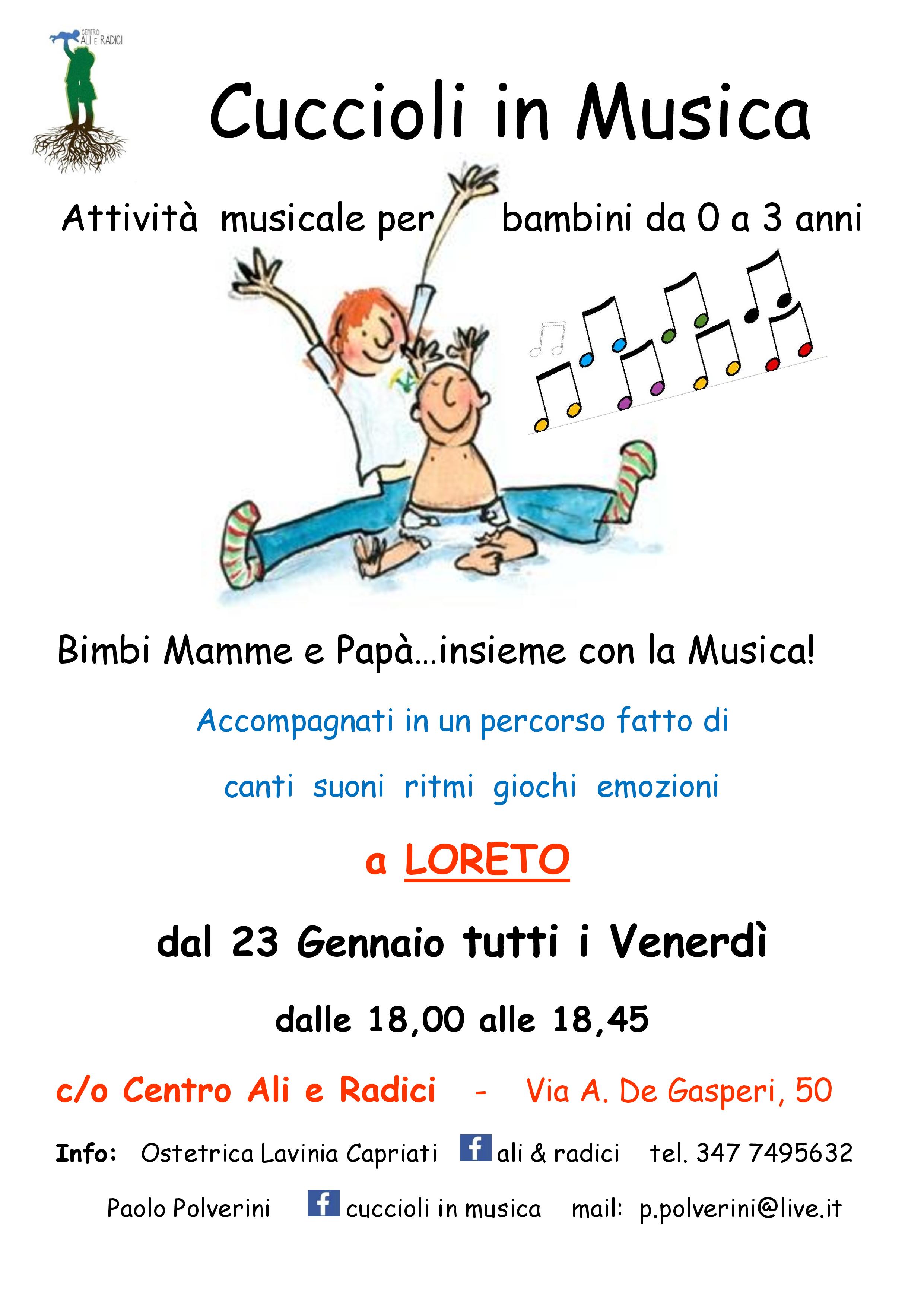 Cuccioli in musica propone un percorso di canti, suoni e giochi musicali dedicato ai piccolissimi (0-3 anni) e a chi si cura di loro. Un momento di coccole musicali, nel quale ai bambini non sarà chiesto di “fare”, ma di sentire e di essere, nel rispetto dei tempi, delle attitudini e dell’unicità di ciascuno.